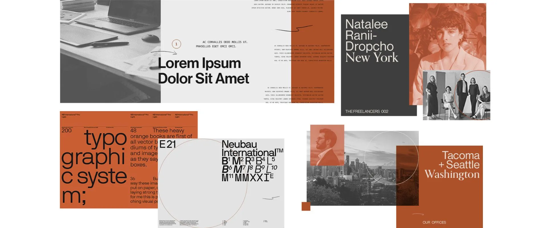 - Photography style blends duotone and black-and-white imagery, layered with subtle overlays