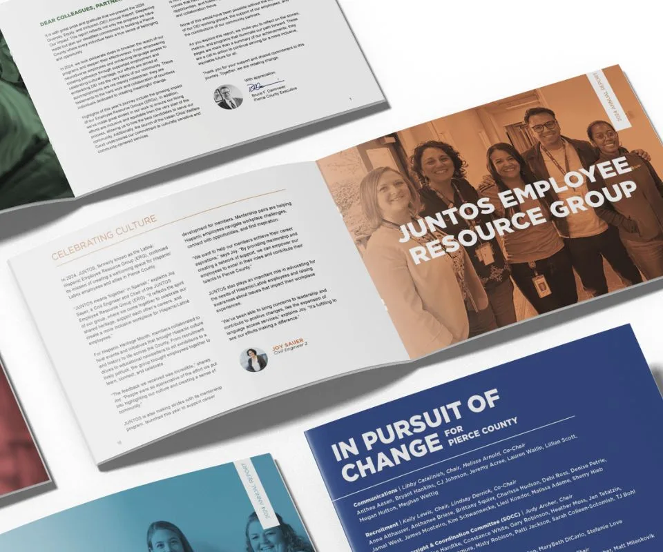We partnered closely with Pierce County to bring this vision to life, capturing the voices of employees and the communities they serve. Every photo, page, and story worked together to highlight how DEI efforts are woven into the fabric of the County’s work.